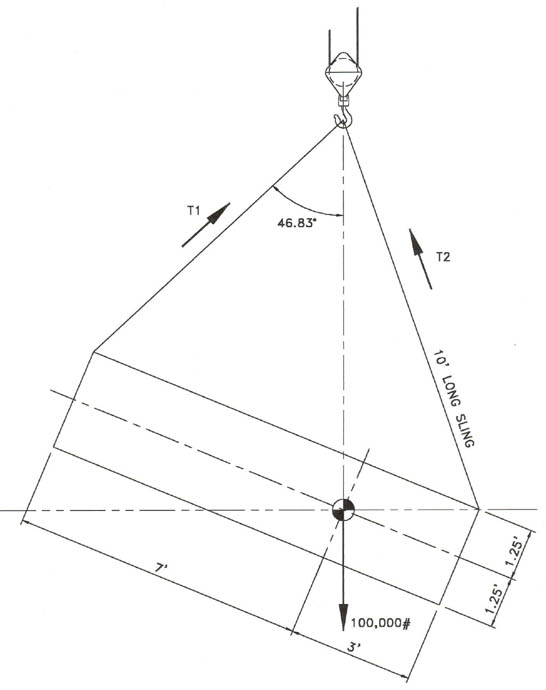 Given the sketch below:For each sling, find the tension in pounds.T1=_____________ T2=____________