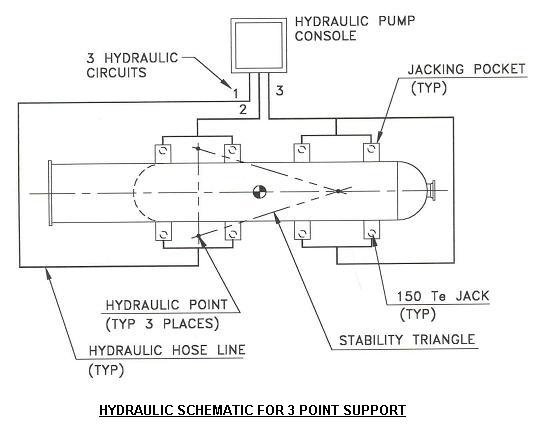 Note that another way to make a three point hydraulic support system for this example is to plumb jacks L1 + L2 + L3 into circuit 1, plumb jacks R1 + R2 + R3 into circuit 2, and plumb jacks L4 + R4 into circuit 3. This will lower the individual jack loads to 138.89 Te for the jacks at saddles 1, 2 & 3, and 83.33 Te for the jacks at saddle 4. The down side is that the CG of the reactor will then be located 2 units from the base of the stability triangle. Depending on the jacking requirements, the CG being that close to the base of the stability triangle may not provide enough stability for tipping in the longitudinal direction of the reactor. It is left to the reader to draw the schematic for the above three point support system and to verify the individual jack loads.