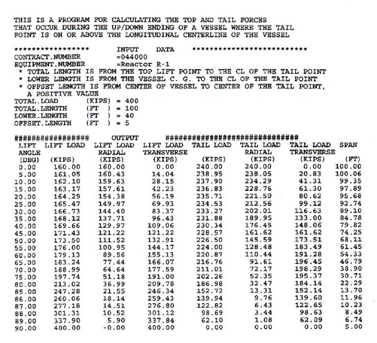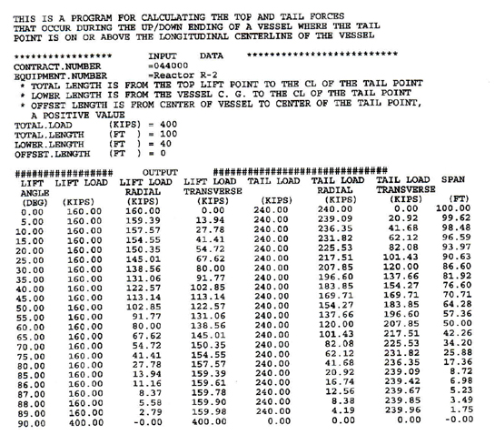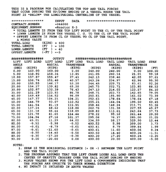 Refer to page two for reactor R-1 and note that the Tail Load at initial pick in the horizontal is 240 kips . This value is found by the following formula: 60' * 200 ton/ 100' = 120 ton = 240 kips. As the reactor is up ended, the Tail Load gradually decreases in a predictable manner down to 0.0 kips until the lift crane has the full load. As a general rule of thumb for this case, the Tail Load at 85 degrees is still 50 to 70 % of the original Tail Load at initial pick, depending on the location of the center of gravity and the off set of the tail lug from the reactor centerline. Final Up ending between 85 and 90 degrees should be done very slowly so the full load of the reactor is gradually transferred to the lift crane.
