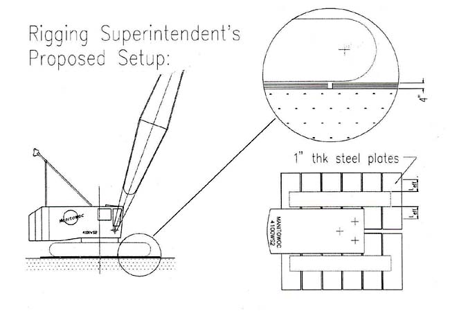 The rigging superintendent, hurrying to meet schedule, brings out one-inch thick trench plates and tells the operator to hurry up and walk his crane onto the plates. The operator refuses and insists on timber mats. The superintendent says he has enough plates to stack four-high under each track and "that's got to be better than one layer of timber mats!" The operator still refuses.