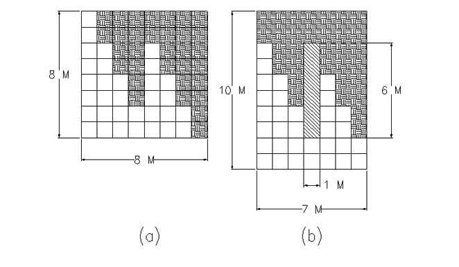 Cut the 8 m x 8 m plate in two pieces as shown in Figure-a. Move the crosshatched piece (the one on the right side) up and lap it over the left piece so that a total width of both pieces is 7 m and a total height is 10 m. See Figure-b.