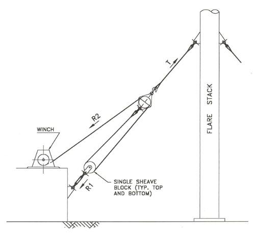 The tensioning system shown is one of three being used to plumb and support a flare stack. The other two tensioning systems are not shown for clarity.