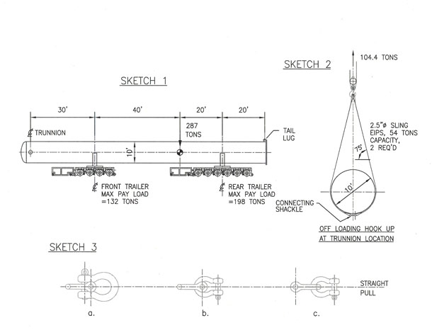 1. Assuming that the crane has adequate lifting capacity and that the trailers are stable for tipping, can the vertical vessel shown in sketch 1 be safely offloaded and placed on cribbing using one crane lifting at either the trunnions or the tail lug? (a.) Yes (b.) No