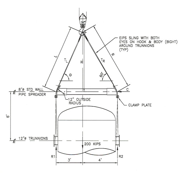 1. Unknown angle, forces and lengths where C = the compressive force in the pipe, TL and TR = the tension in the inclined portions of the slings above the pipe spreader bar.