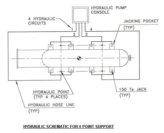 Note that another way to make a three point hydraulic support system for this example is to plumb jacks L1 + L2 + L3 into circuit 1, plumb jacks R1 + R2 + R3 into circuit 2, and plumb jacks L4 + R4 into circuit 3. This will lower the individual jack loads to 138.89 Te for the jacks at saddles 1, 2 & 3, and 83.33 Te for the jacks at saddle 4. The down side is that the CG of the reactor will then be located 2 units from the base of the stability triangle. Depending on the jacking requirements, the CG being that close to the base of the stability triangle may not provide enough stability for tipping in the longitudinal direction of the reactor. It is left to the reader to draw the schematic for the above three point support system and to verify the individual jack loads.